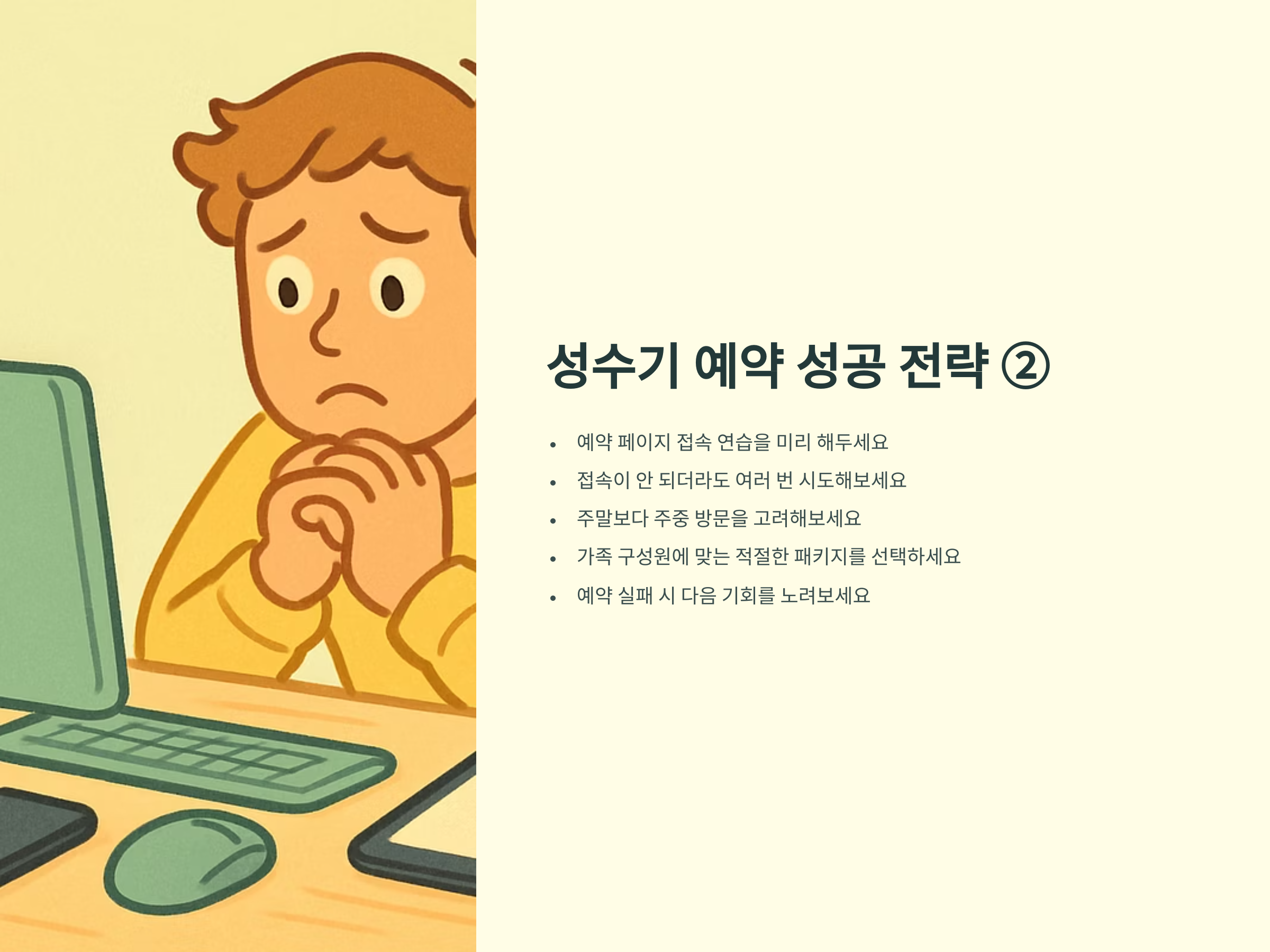 주말보다 주중이 예약이 좀 더 수월할 수 있어요. 또 가족 구성원에 맞춰 적절한 패키지를 선택하는 것도 경제적으로 도움이 될 거예요. 그리고 혹시라도 예약에 실패하더라도 너무 실망하지 마세요. 다음 기회를 노려보는 것도 좋은 방법이랍니다!