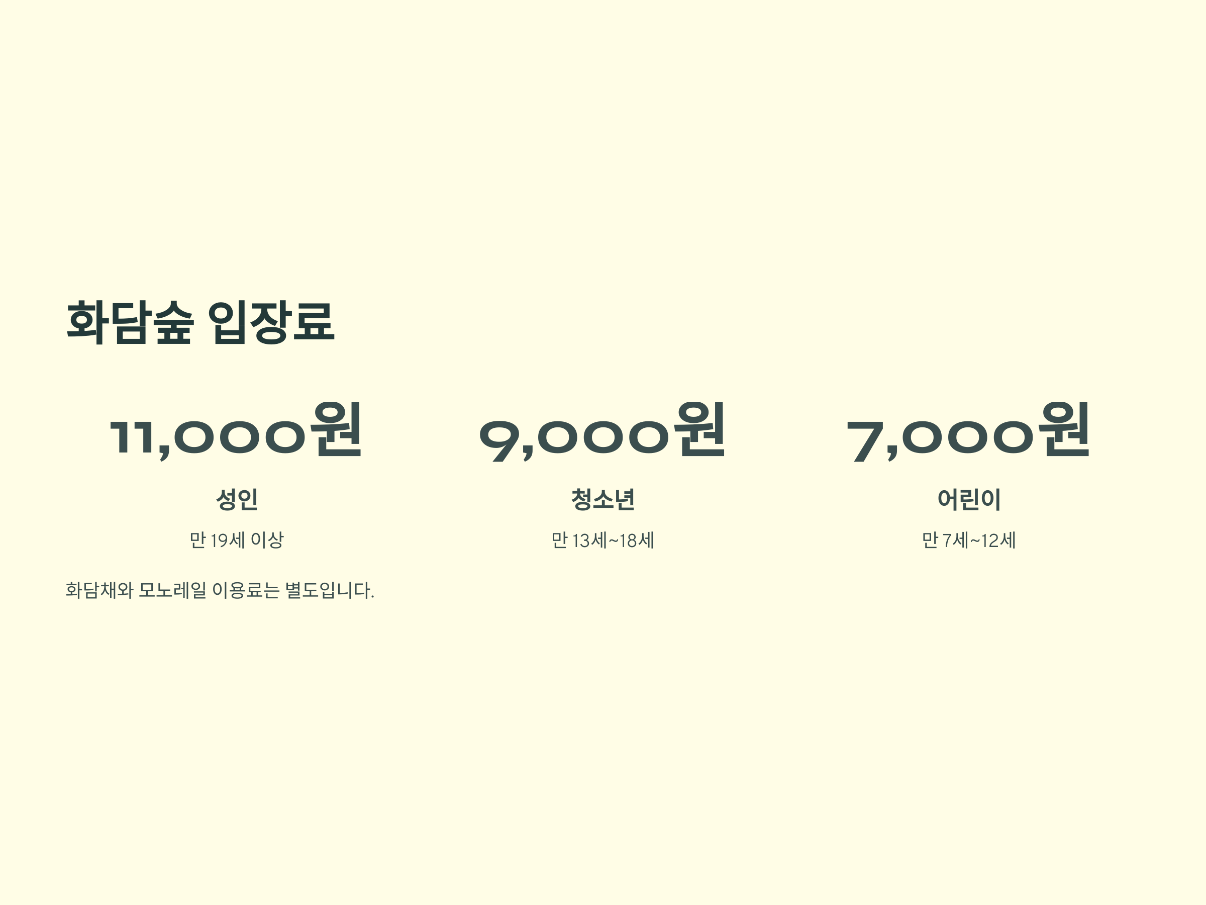 화담숲 입장료는 성인 11,000원, 청소년 9,000원, 어린이 7,000원이에요. 화담채나 모노레일 이용료는 별도니까 참고하세요. 하지만 할인 혜택이 꽤 많아요! 장애인, 국가유공자, 광주시민 등은 할인을 받을 수 있고, 증빙 서류만 있으면 돼요.
