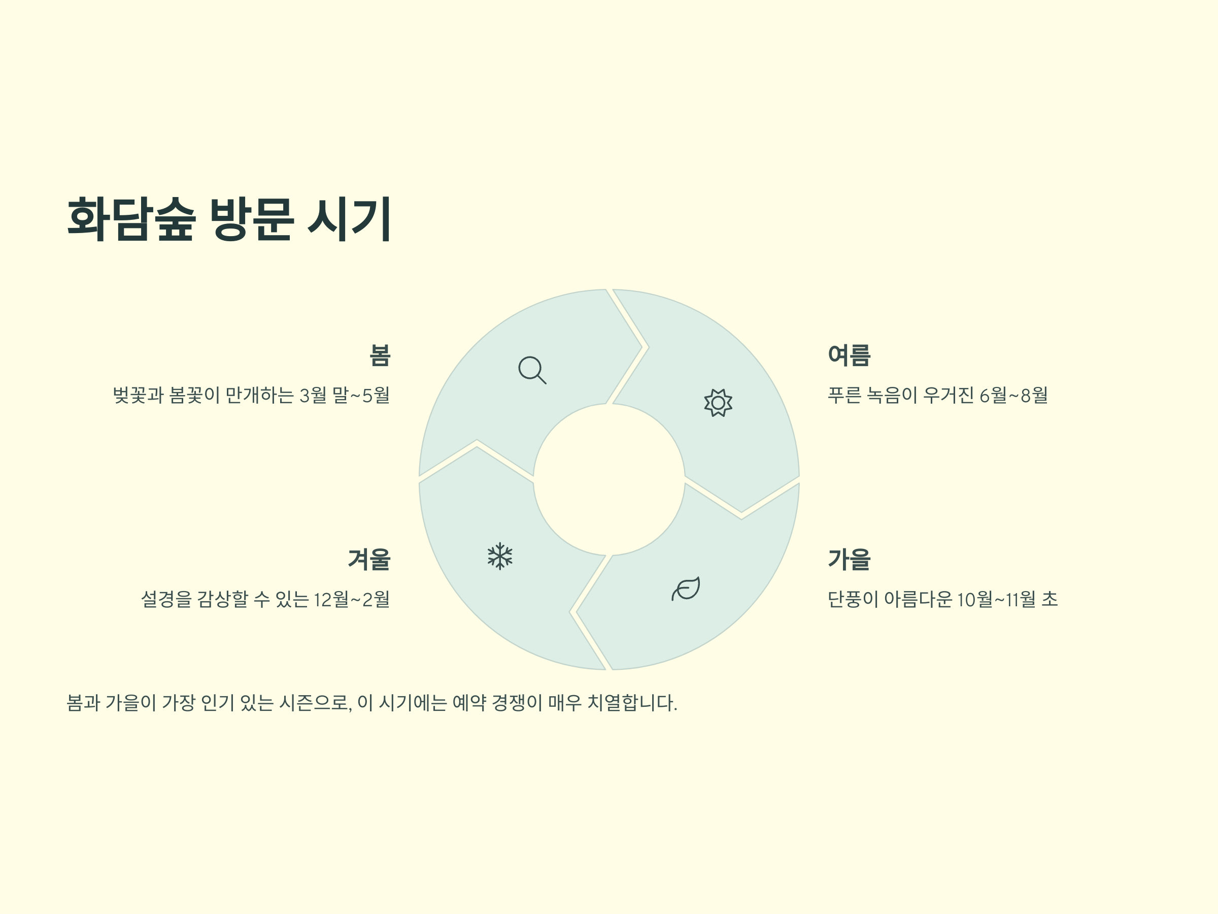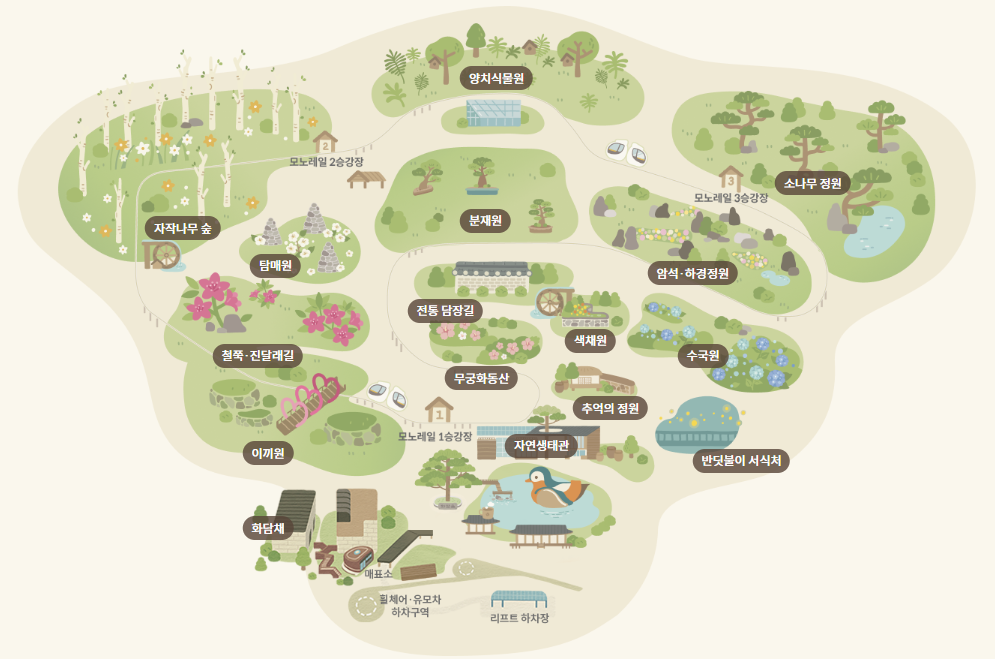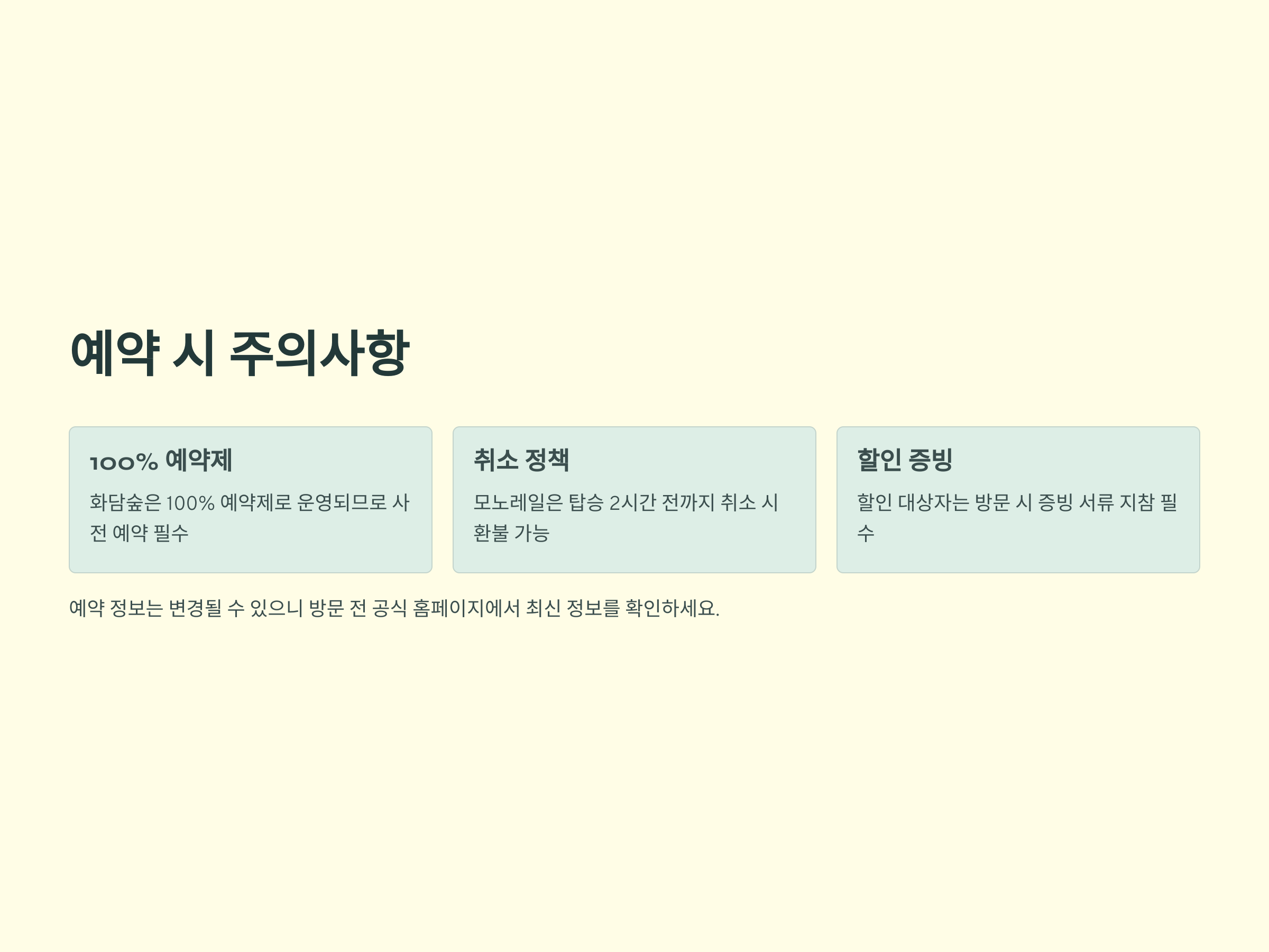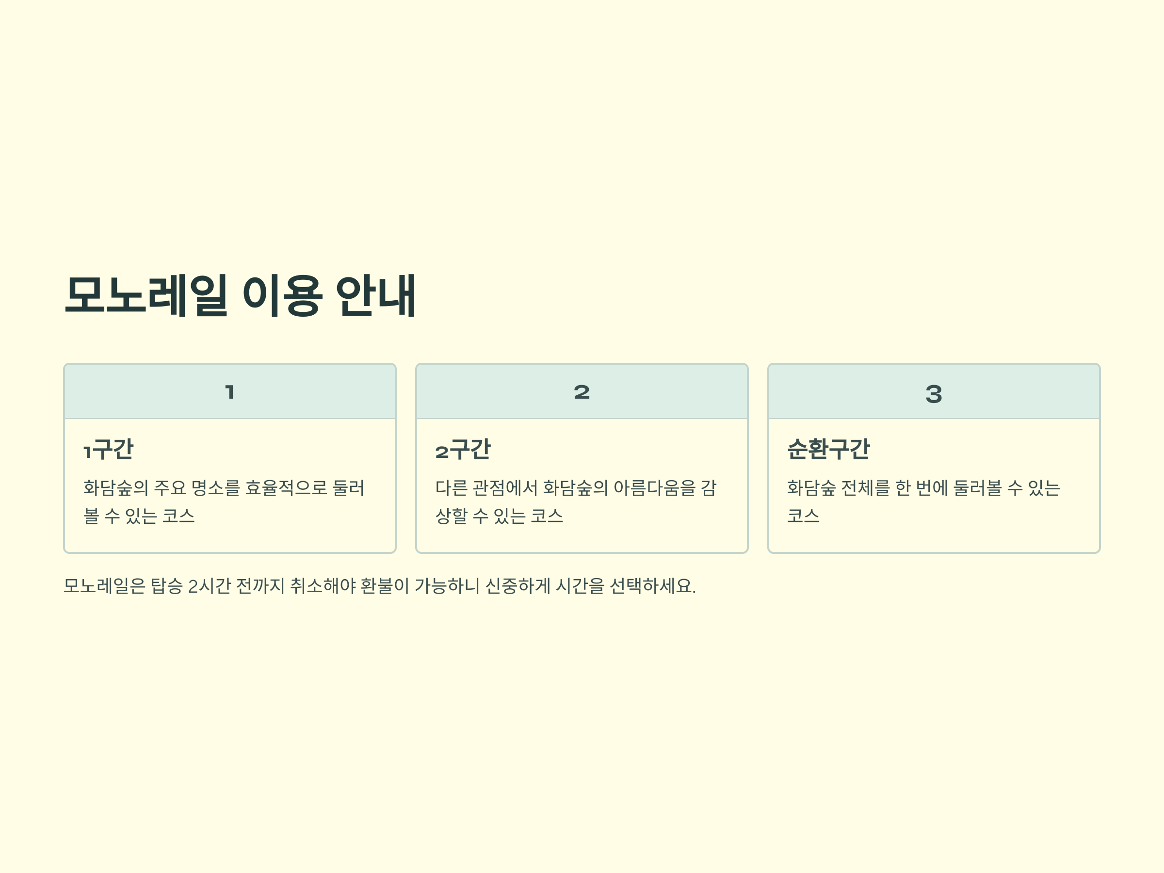 모노레일은 1, 2구간, 순환구간으로 나뉘고 가격도 다르니 미리 확인해야 해요. 화담채는 화담숲 예약과 함께 할 수 있어 편리하답니다. 그리고 중요한 점! 모노레일은 탑승 2시간 전까지 취소해야 환불이 가능하니 신중하게 시간을 선택해야 해요.