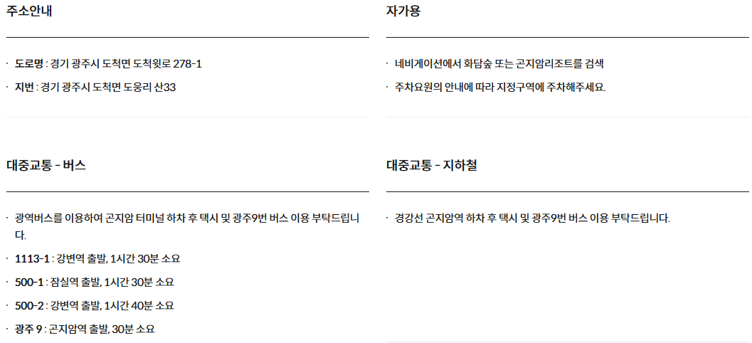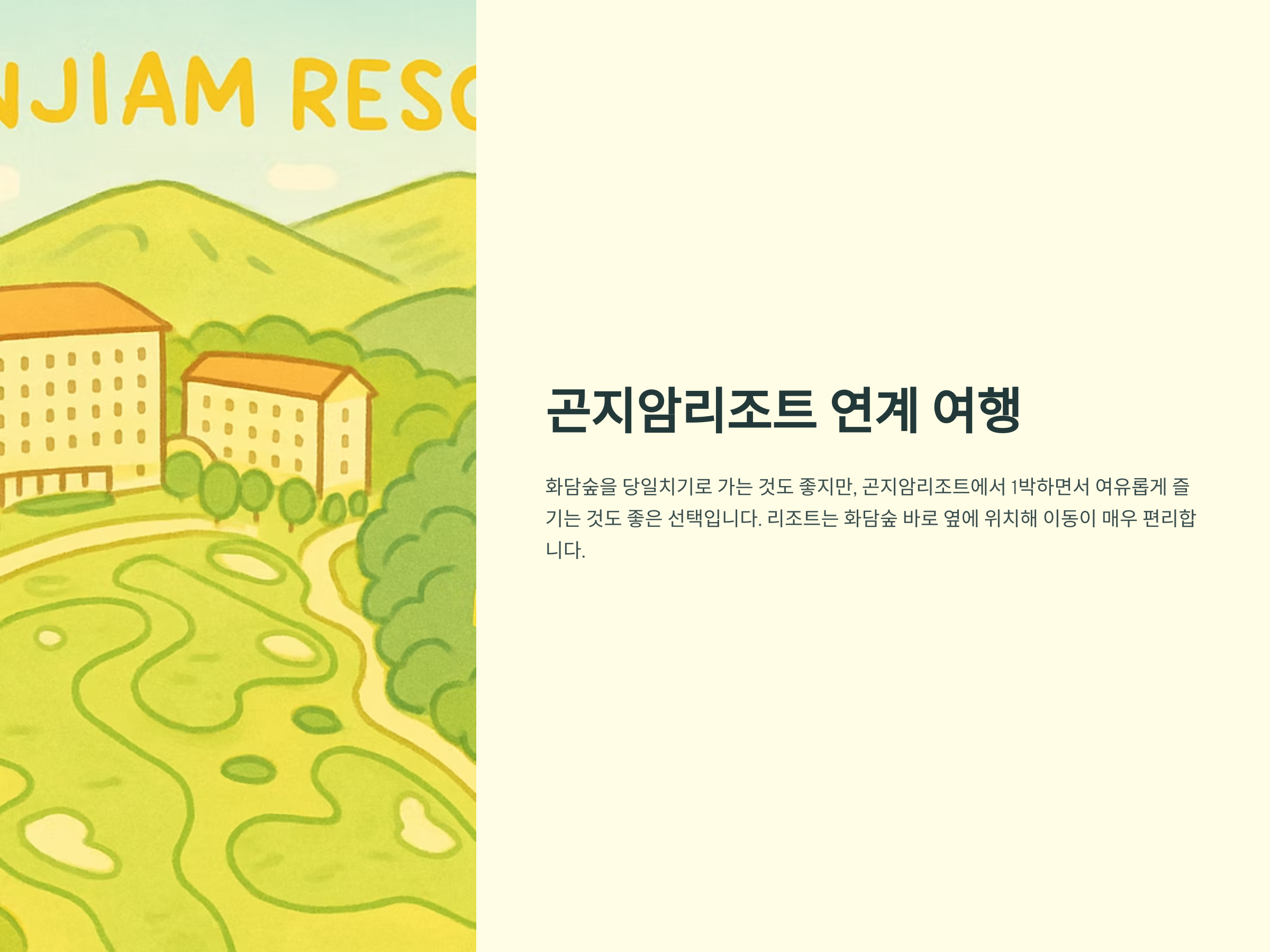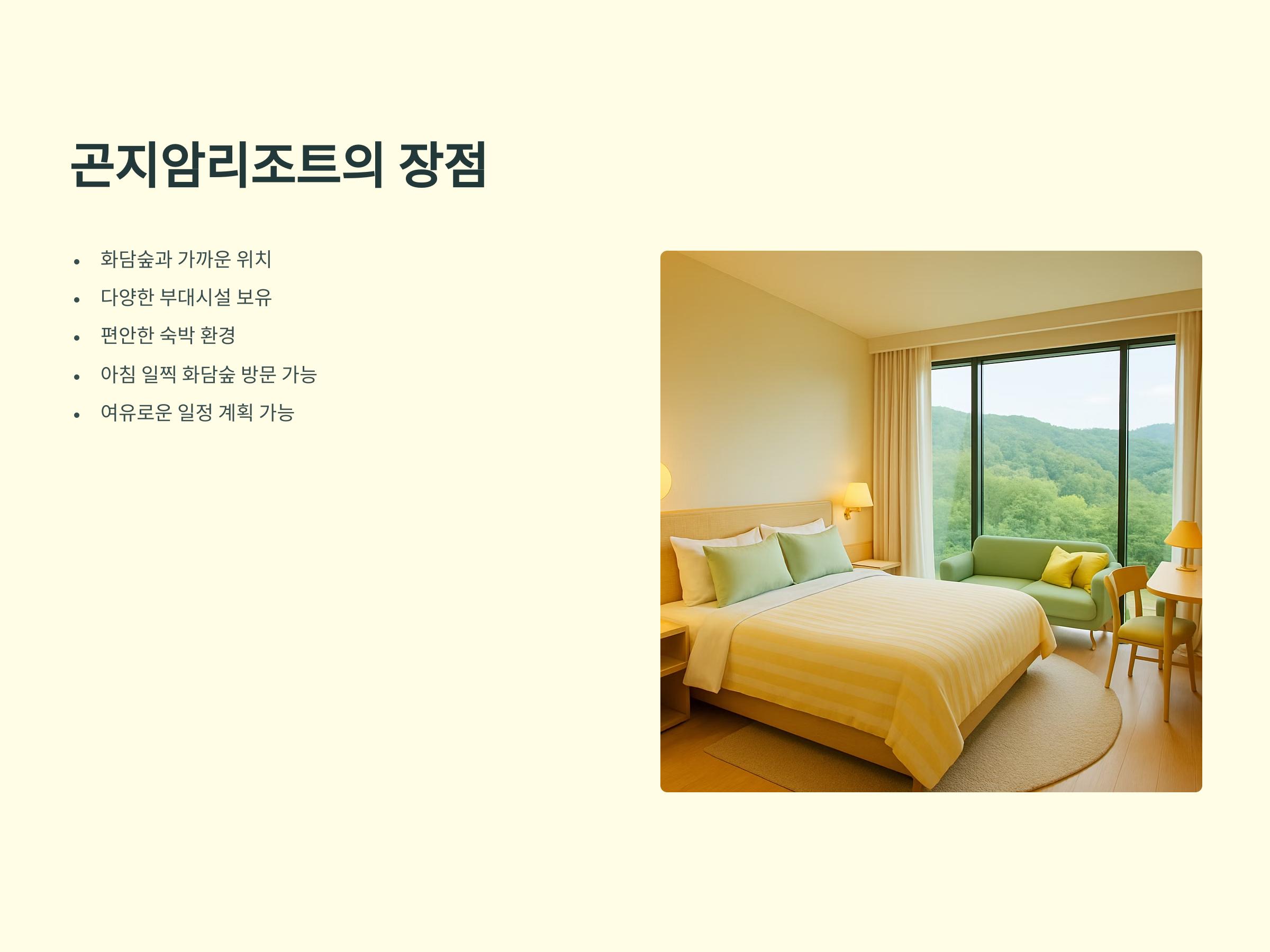 화담숲을 당일치기로 가는 것도 좋지만, 곤지암리조트에서 1박하면서 여유롭게 즐기는 건 어떨까요? 곤지암리조트는 화담숲 바로 옆에 있어서 이동이 편리해요. 다양한 시설과 숙소도 갖추고 있고요.
