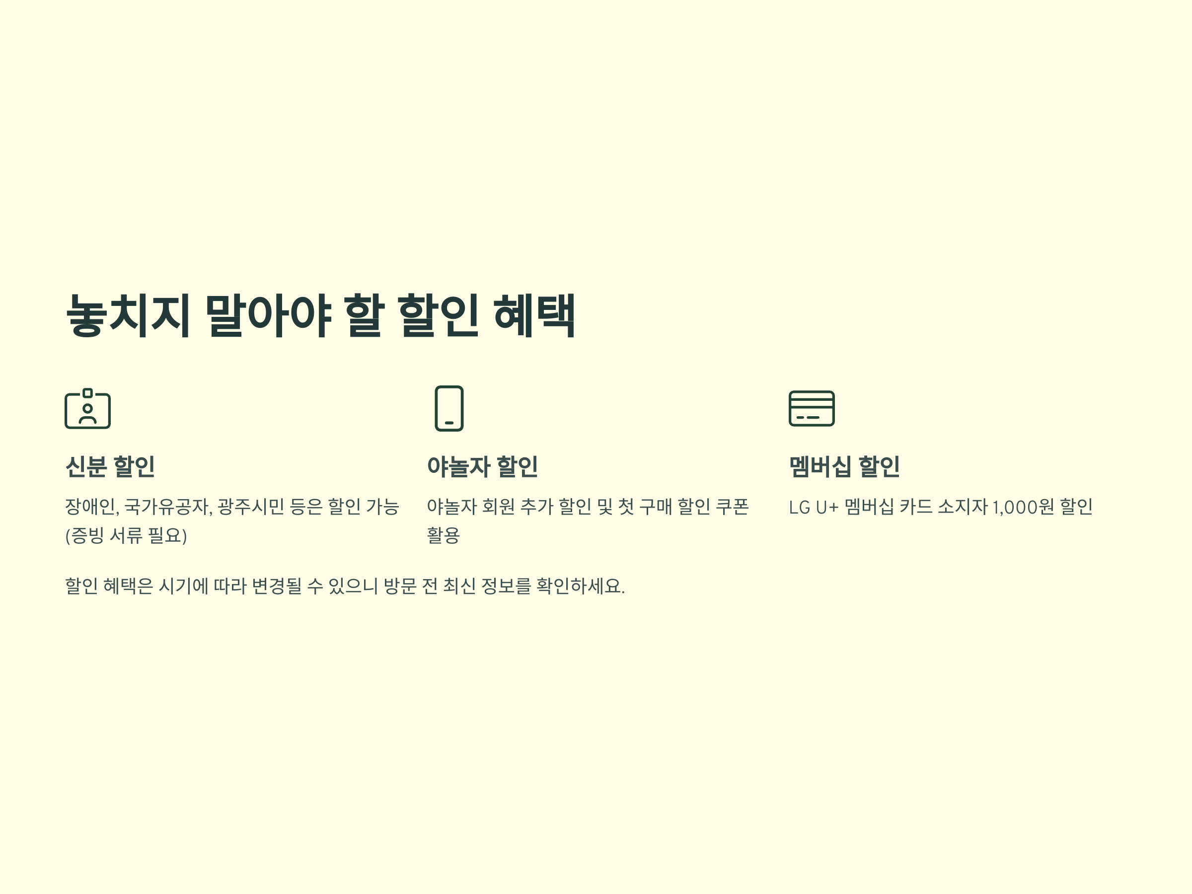 야놀자 회원이라면 추가 할인도 가능하고, 첫 구매 할인 쿠폰도 챙길 수 있다는 사실! 저는 야놀자 할인 덕분에 꽤 저렴하게 예약했어요. 그리고 LG U+ 멤버십 카드가 있다면 1,000원 할인도 가능해요. 저는 멤버십 카드 덕분에 추가 할인을 받을 수 있었답니다.