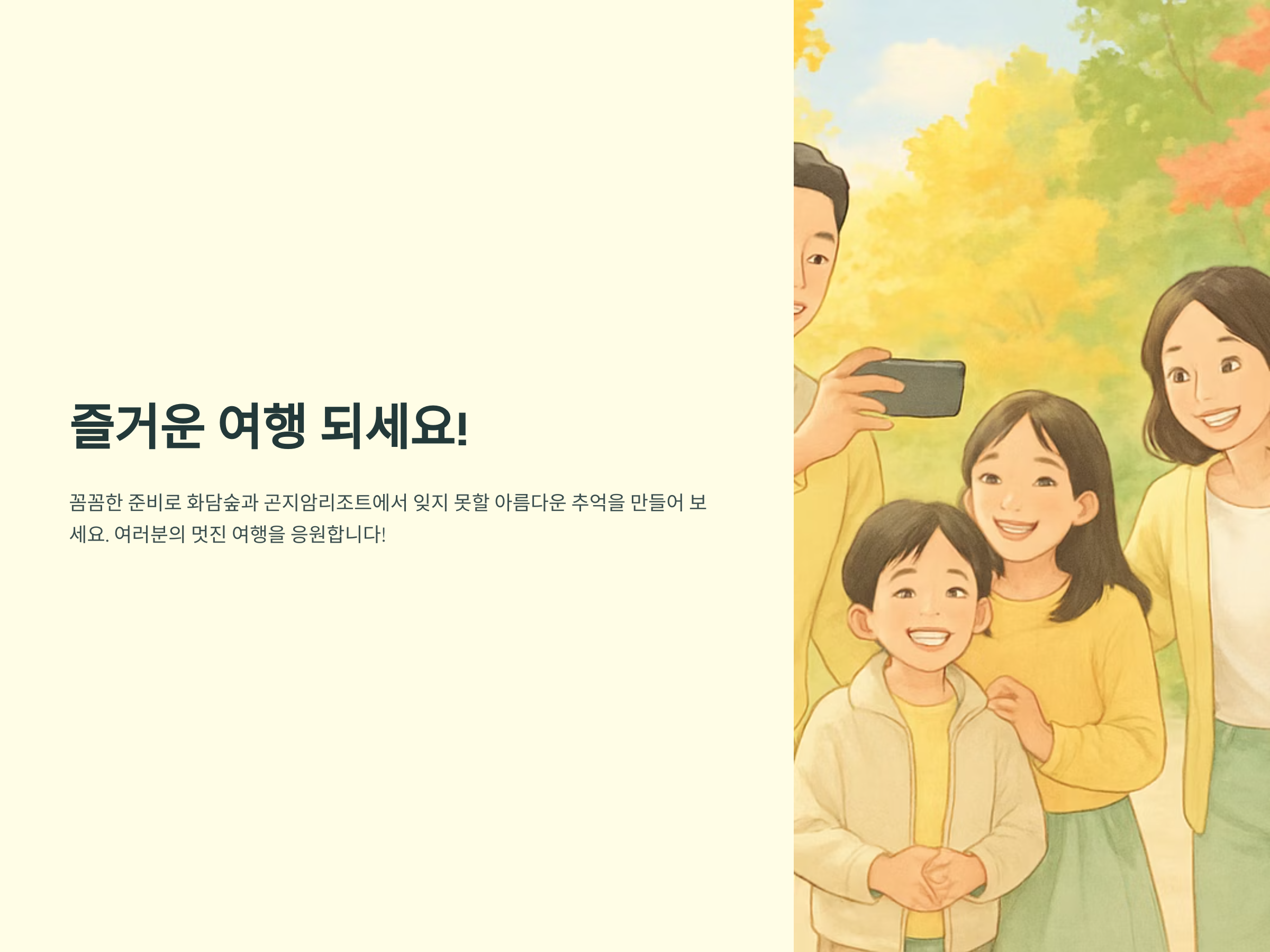 곤지암리조트와 연계하면 더욱 완벽한 여행이 될 거예요. 꼼꼼한 준비로 아름다운 추억을 만들어 보세요! 잊지 못할 여행이 될 거예요. 즐거운 여행 되세요!